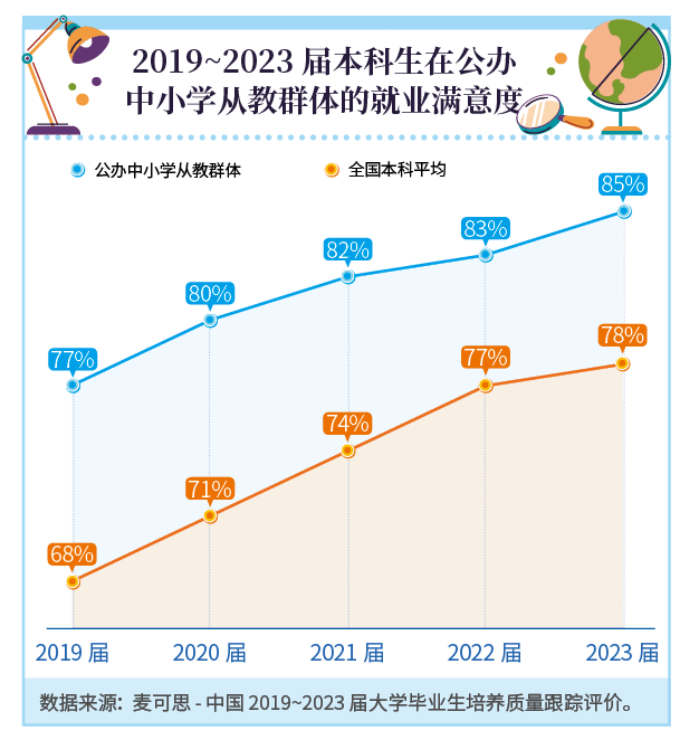 教师职业对高校毕业生的吸引力越来越强,或与从教群体的就业幸福感较高有关。麦可思研究发现,在公办中小学从教(即从事"中小学教育"类职业,下同)的应届本科生就业满意度持续处于较高水平。具体来看,2023届从教本科生就业满意度达到85%,比全国本科平均(78%)高出7个百分点。